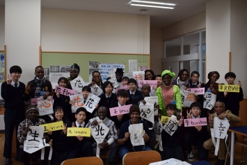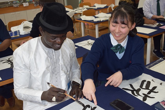 2月17日(月)JICA研修員13名が来校され、新校舎見学、授業参観、生徒との交流を行ないました。国籍はガボン,ギニア,コートジボワール,ジブチ,セネガル,チャド,ニジェール,ブルキナファソ,ベナン,マダガスカル,マリ,モーリタニア,中央アフリカの13か国(フランス語圏)。英語を駆使し、積極的に生徒との交流を心がけ、有意義な時間を過されました。新校舎見学後、書道を体験し、1年生の手作りの凧に清書しました。1年生の合唱で歓迎を受けた後、凧あげをしたり、授業見学をしたりそれぞれの時間を過しました。中学校3年生との交流では、各クラス2~3名ごとに、自国のプレゼンテーションを行い、生徒からの質問や、自分の国について熱く語ってくださいました。「もっと交流がしたかった。」「英語を勉強し、自分の思いを伝えられるようにしたい。」「アフリカの知らないことを知れてよい機会だった。」という意見が多く、生徒にとっても刺激のある一日となったようです。研修員の皆様、JICAの職員の皆様、様々なご支援を頂き、誠にありがとうございました。
