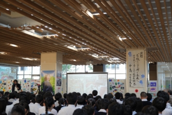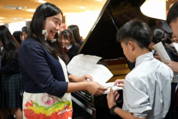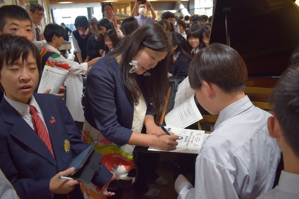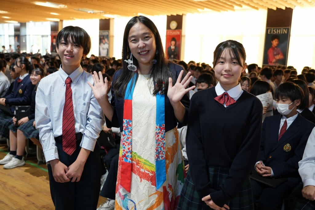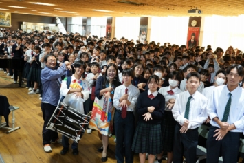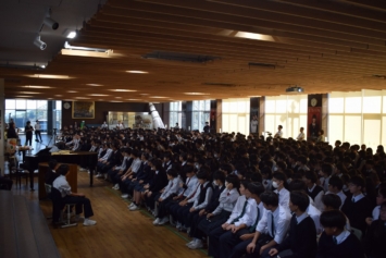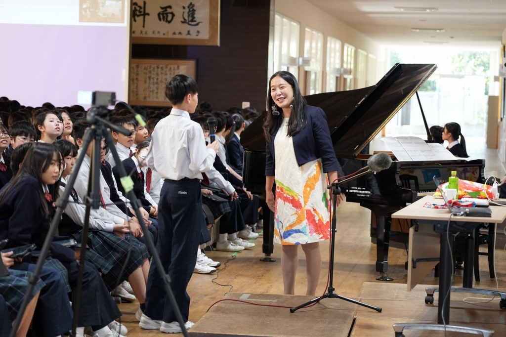 当日は、失敗の連続だからこそ面白い数学の魅力、教科を横断した掛け算による創造力で問題解決力を高めるSTEAM教育の実践、万博パビリオンに込めた思いや完成までの道のりなどバラエティに富んだ講話に中学生も高校生も聴き入りました。音楽×テクノロジーのデモンストレーションや、情熱的なピアノ演奏(太鼓とコラボ演奏)もあり、会場のボルテージは最高潮に。お楽しみの質問コーナー「教えて!さち子先生!」も盛り上がりました。