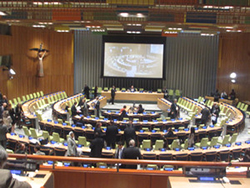会場は国連本部の地下にある会議室で、意外に狭く、聴衆は平和首長会議の参加首長のうち20人ほどだったでしょうか。「ひろしま平和文化センター」の小溝理事長が高校生を紹介してくださり、いよいよプレゼンテーションが始まりました。