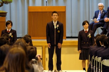 その後、校長先生、理事長先生が祝辞を述べられました。3年前は小さく、盈進坂を登るのに一苦労だった生徒たちが、この3年間で心身ともに立派に育ったことについて感慨のことばとともに、盈進高校での3年間でより自分を鍛えていくようにと激励されました。