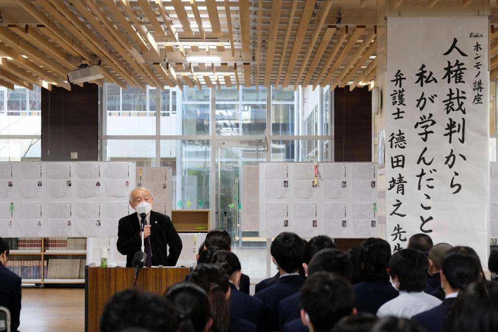 徳田弁護士は1973年から大分県で弁護士活動を始められ、これまで多くの人権裁判に関わってこられました。特に、2002年のハンセン病国家訴訟で勝利判決を勝ち取ったことで有名です。延校長とも長年、ハンセン病問題を通じて長年の間ご親交があり、この度、盈進までお越しいただきました。