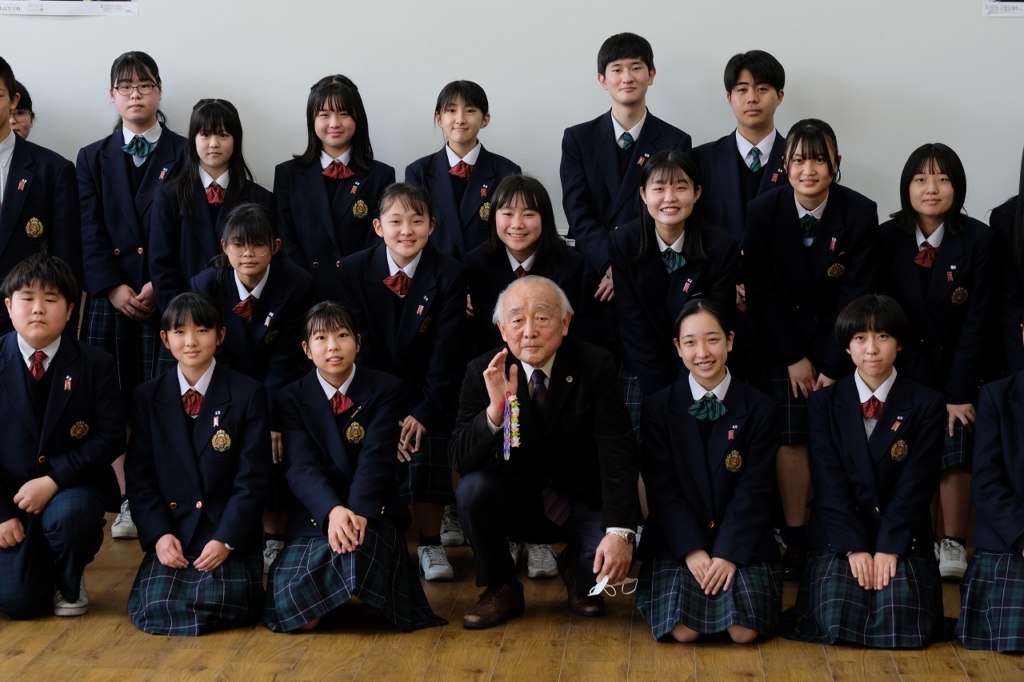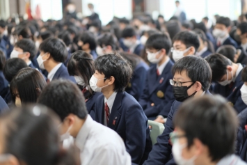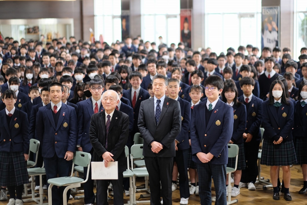 徳田弁護士は、ハンセン病訴訟で勝利し、国が控訴をしなかったとき、涙を流して喜ばれたそうです。ハンセン病問題は「人間回復裁判」と言われています。徳田弁護士はお話の中で「『生きる』というのは、素晴らしい人たちと出会うこと」とおっしゃっていました。長年の弁護士活動で、たくさんの人たちに出会い、たくさんの人生と向き合ってきたからこそ出る言葉に、会場中が感動の雰囲気に包まれました。特に、中学生は全員、1年次に「ハンセン病問題から学ぶ」という授業を6年の先輩から受けてきています。先輩から学んだことと今日のお話が重なり、差別のひどさとそれを乗り越える人間の強さ、そして徳田弁護士のような、寄り添い続ける方がいたから国家訴訟に勝利したことを知ることができました。