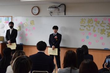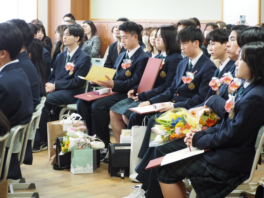 そして、松岡宏道理事長からは、建学の精神「実学の体得」を胸に未来で活躍してほしいという言葉が贈られました。そして、生徒の卒業文集をご覧になり、たくさんの生徒たちが「仲間の存在の大きさ」について語っていたことに触れ、これからも仲間を大切にしてほしいと語られました。