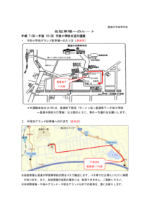 ※当日の朝は、地図上の矢印の位置で学園関係者が誘導します。時間前に、学校周辺の道路に駐車待機されることは、住民の方に迷惑をかけることになりますので固くお断りします。